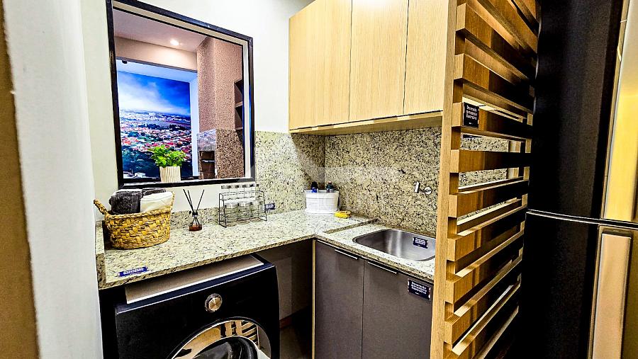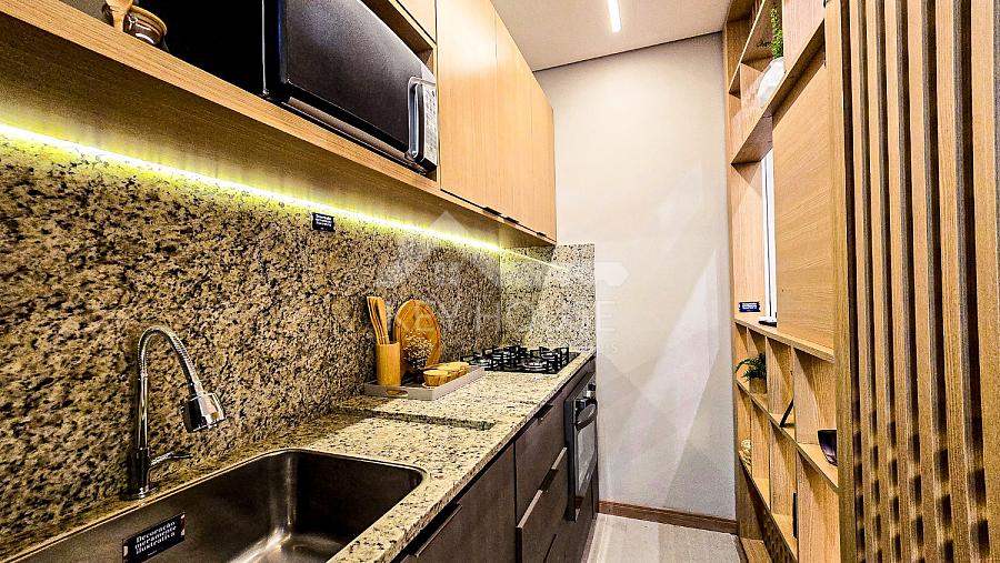 Entregue com piso porcelanto nas áreas molhadas, bancada da cozinha em granito e cuba em inox. Já na área de serviço o tanque é em louça.
