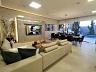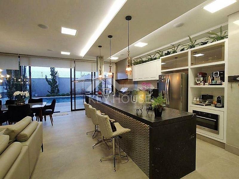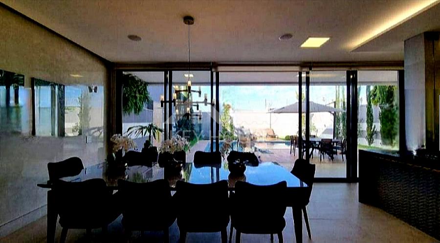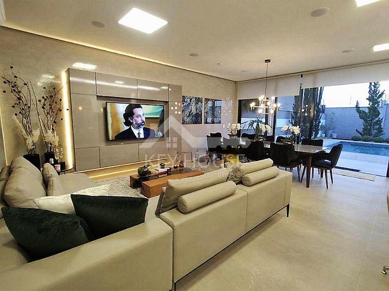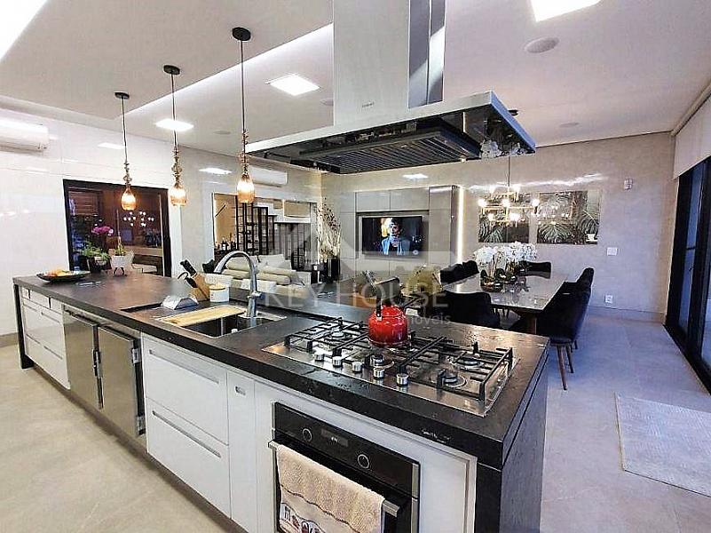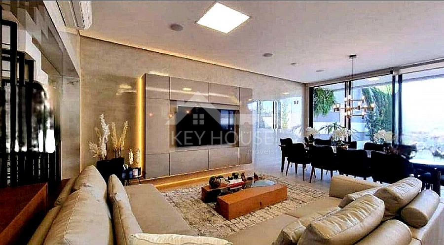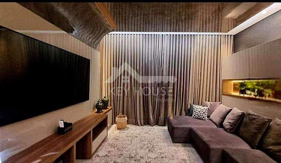 Sala de estar com televisão, integrada com sala de jantar, cozinha gourmet em ilha com balcão refrigerado, ambientes climatizados e com acústica, churrasqueira a gás com integração para área de lazer.